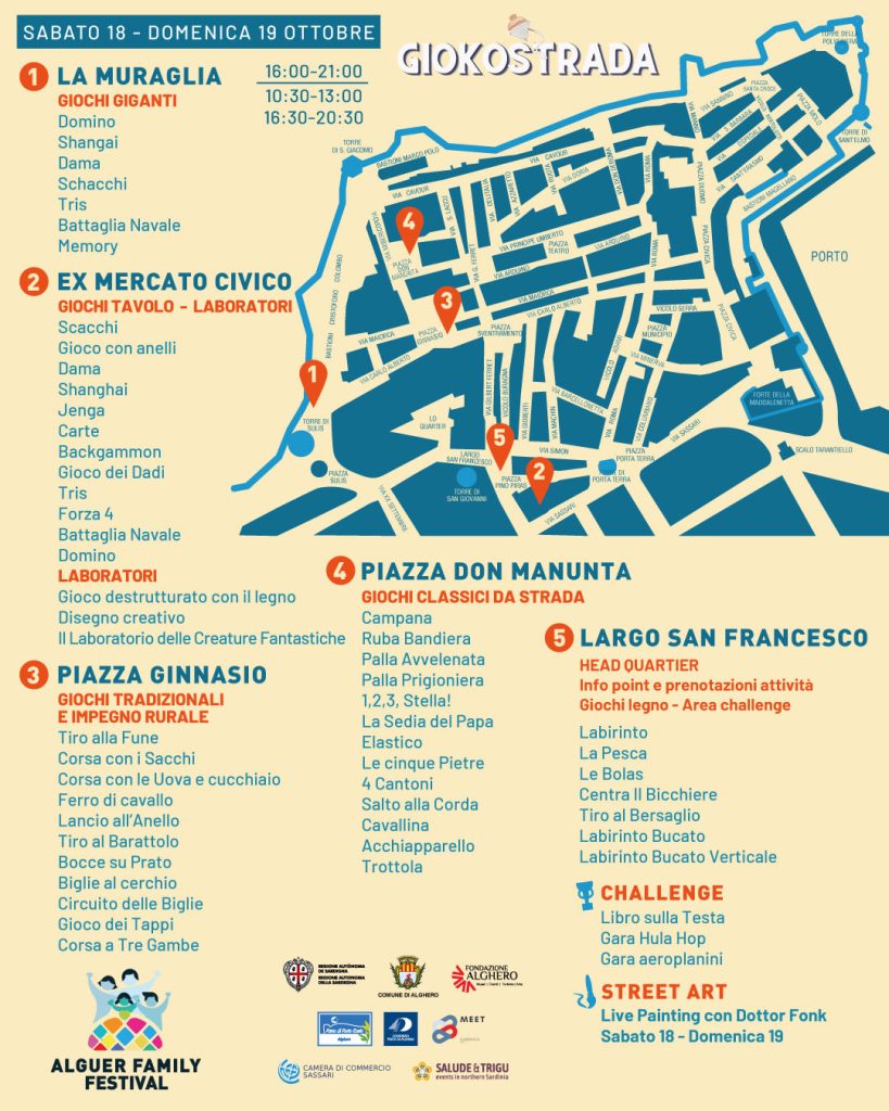 Sabato 18 ottobre, dalle 16:00 alle 21:00, e domenica 19 ottobre, dalle 10:00 alle 13:00 e dalle 16:00 alle 20:30, il centro storico di Alghero ospiterà all’interno dell‘Alguer Family Festival, Giokostrada 2025 , un evento diffuso che animerà vie e piazze con giochi, laboratori e attività creative per tutte le età.
